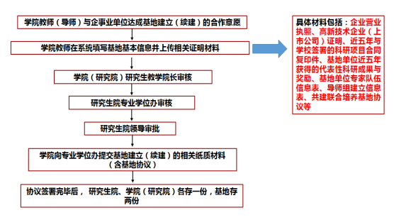 学校教师(导师)如需建立或续建研究生联合培养基地,须在研究生信息管理系统的“专业实践管理”模块的“实践基地申请”目录中点击“新增”按钮,填写、提交基地相关信息并上传证明材料,具体工作流程如下,详见链接:http://grs.cqsbzx.com/G50/90264.jhtml