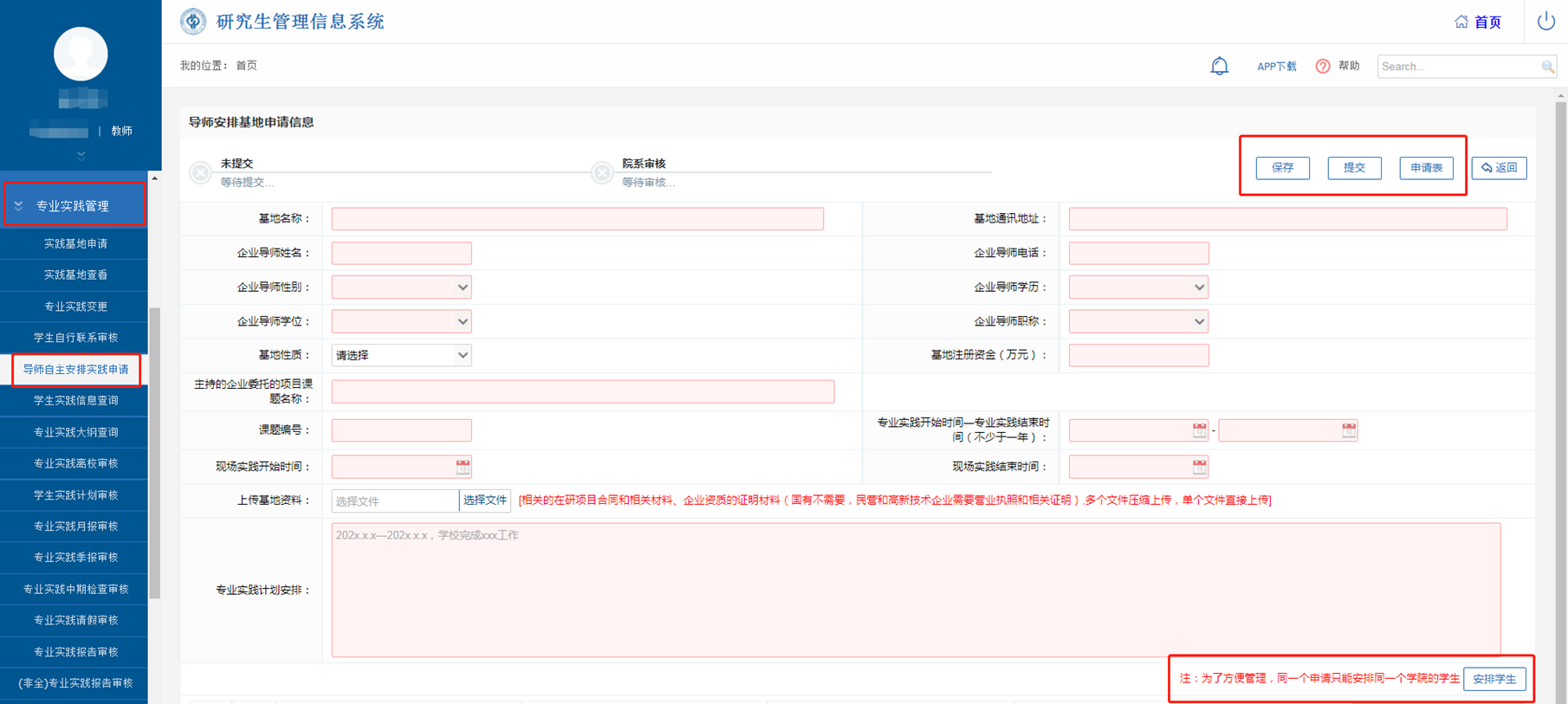 在【实践过程管理】-【导师自主安排实践申请】中进行申请,填写单位信息、企业导师信息,上传在研项目合同等相关材料;同时安排学生(同一个申请只能安排同一个学院的学生);