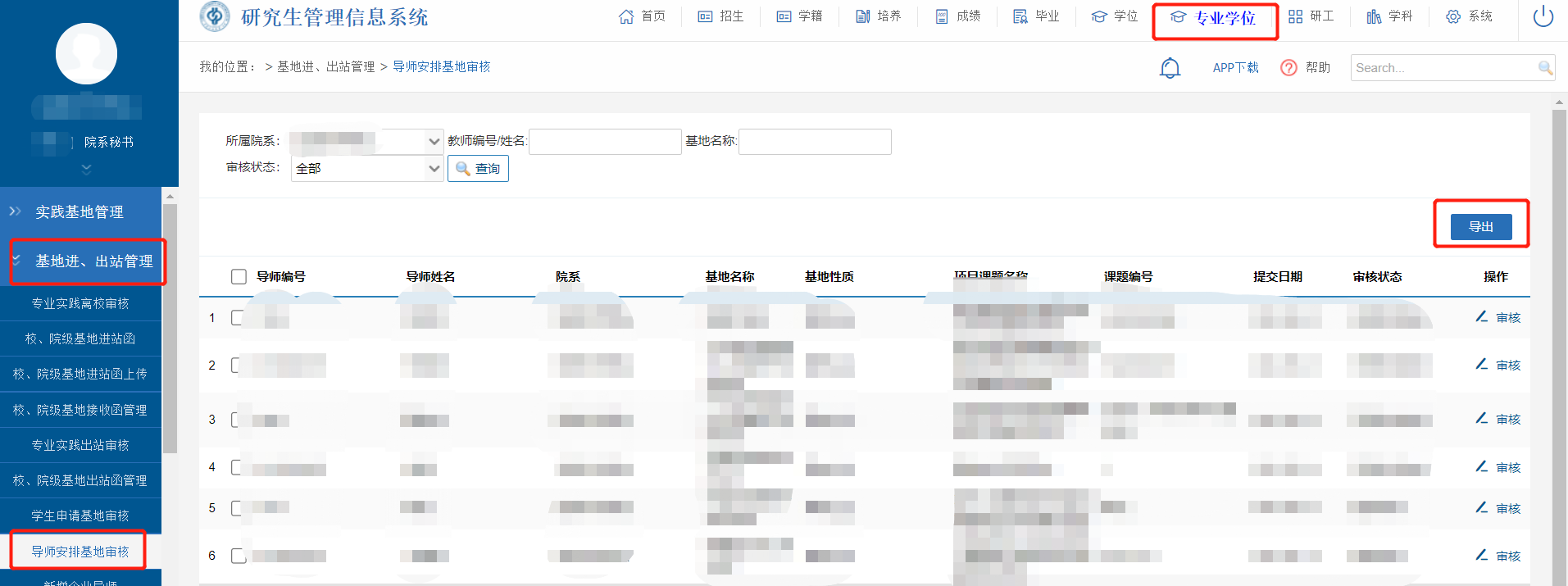 在【专业学位】-【基地进、出站管理】-【导师安排基地审核】中,查看、导出信息。