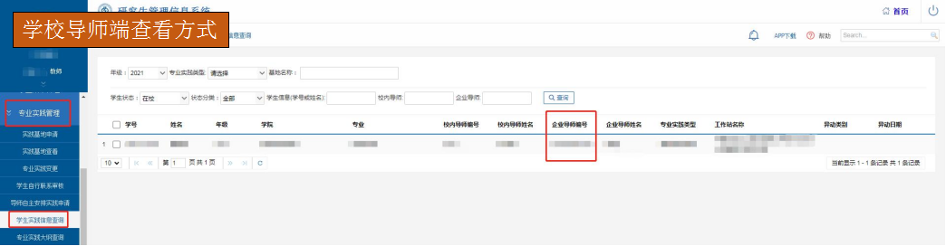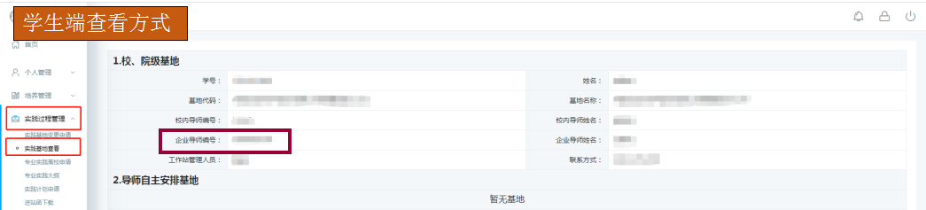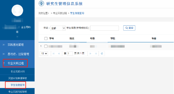 在【专业实践过程】—【学生信息查询】模块中查看本人名下的研究生信息。