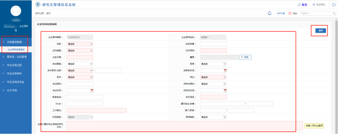 进入系统后,在【实践基地管理】—【企业导师信息维护】模块下,及时更新维护个人基本信息,并“保存” 。维护在系统中的手机号后续可用来找回密码。