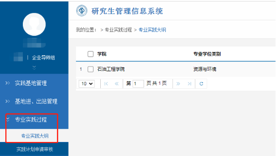 在【专业实践过程】—【专业实践大纲】模块中查询、下载相关专业实践大纲,以便指导研究生科学、合理制订专业实践计划。