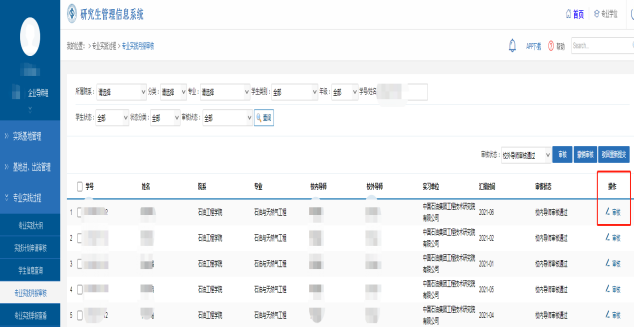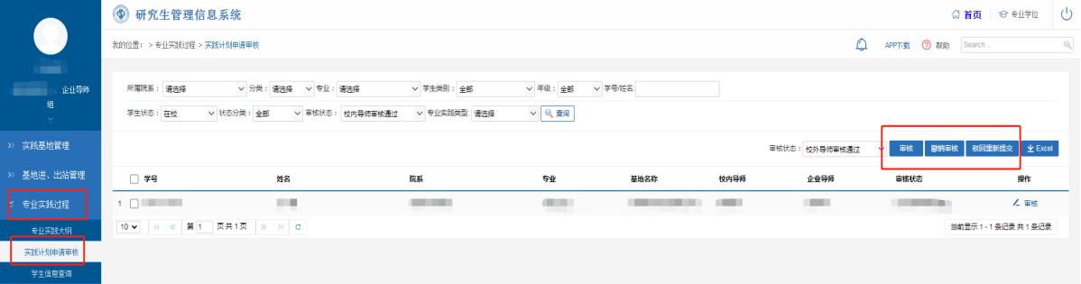 可选择单个学生逐一审核(勾选某个学生学号前面的方框)或批量审核(勾选学号前面的方框,可同时审核名下多个研究生提交的专业实践计划);