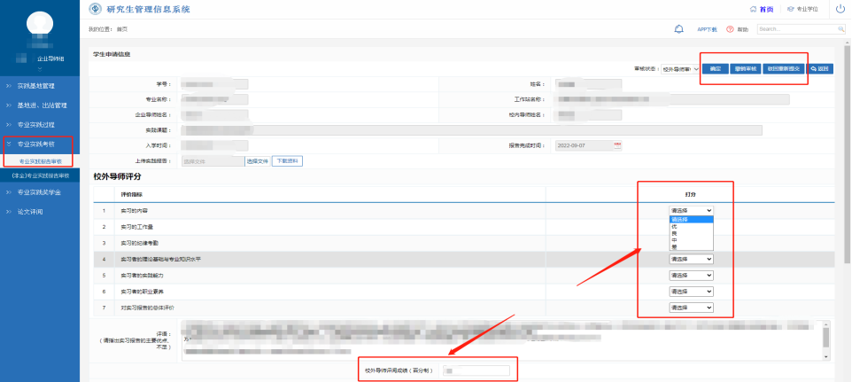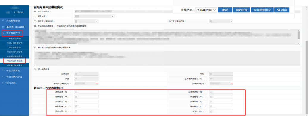 在【专业实践过程】—【专业实践中期检查】模块中,点击“操作”下方的“审核”按钮,对学生专业实践期间的现实表现进行评价打分,并进行确定、撤销审核、驳回重新提交等操作。