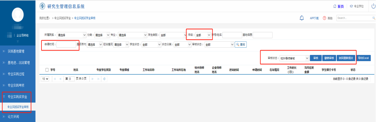 在【专业实践奖学金】—【专业实践奖学金审核】模块下审核学生在站情况;为把握学生实际在站情况,请企业导师按照实际情况审核。