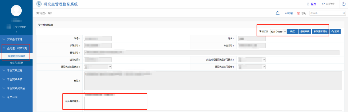 在【基地进、出站管理】—【专业实践出站审核】界面,审核学生出站申请。点击“操作”下方的“审核”按钮,进入审核页面,填写审核意见并进行确定、撤销审核、驳回重新提交等操作。