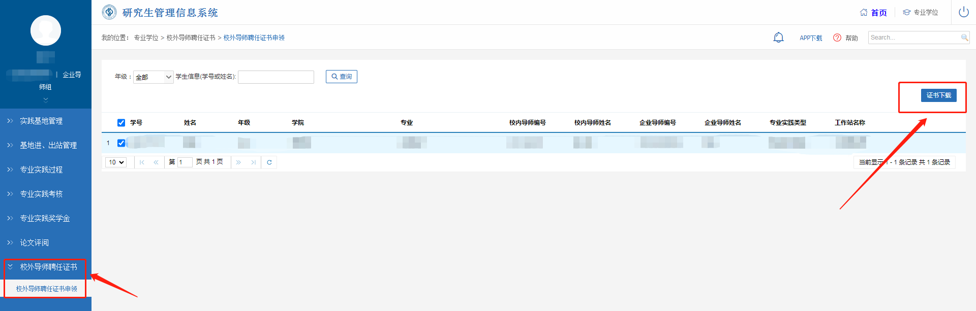 在【校外导师聘任证书】-【校外导师聘任证书申领】界面,勾选学生,点击右上角的“证书下载”按钮,即可下载校外导师聘任证书。