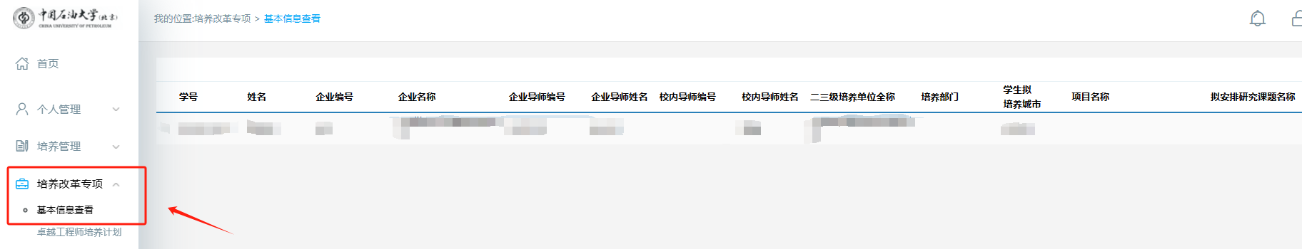 在【培养改革专项】—【基本信息查看】模块,查看培养单位、校企导师账号等相关信息。