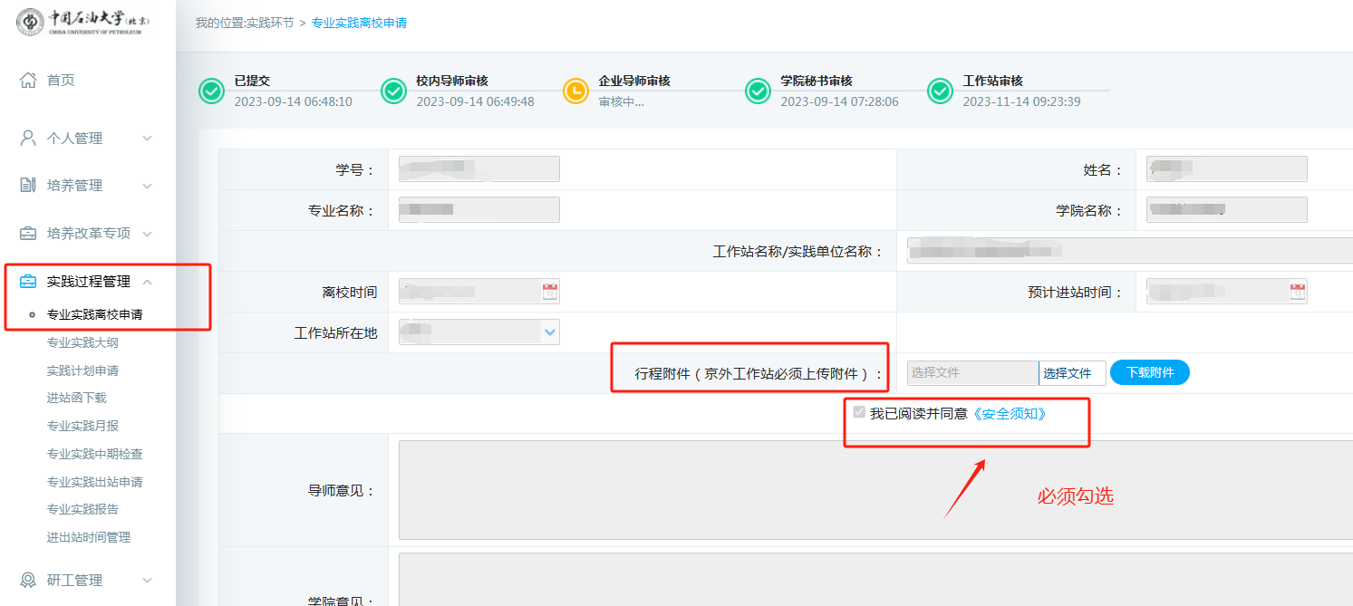 学生确定基地信息,与校企导师确认具备进站条件后,在【实践过程管理】—【专业实践离校申请】填写提交,由校企导师、所在学院主管研究生教学秘书、工作站审核;