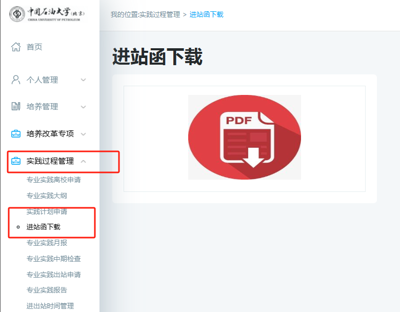 学生提交专业实践离校申请审核流程完成后,系统会自动生成进站函,学生可在研究生管理系统中【实践过程管理】—【进站函下载】界面点击下载。