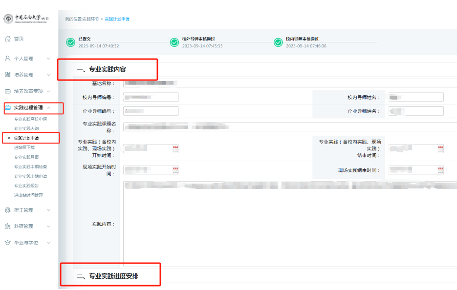 专业实践计划由学校导师与企业导师共同制订,学生在系统【实践过程管理】—【实践计划申请】中填写提交,由校外导师、校内导师审核。