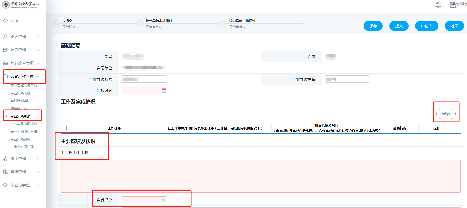 学生在系统中【实践过程管理】—【专业实践月报】模块中填写提交,由校外导师、校内导师审核。