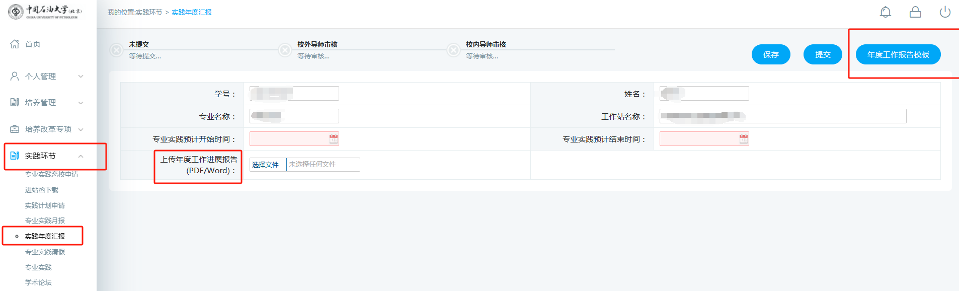 专项博士生在【实践环节】模块,可进行【实践年度汇报】,学生下载报告模板并上传报告,由校外导师、校内导师审核。