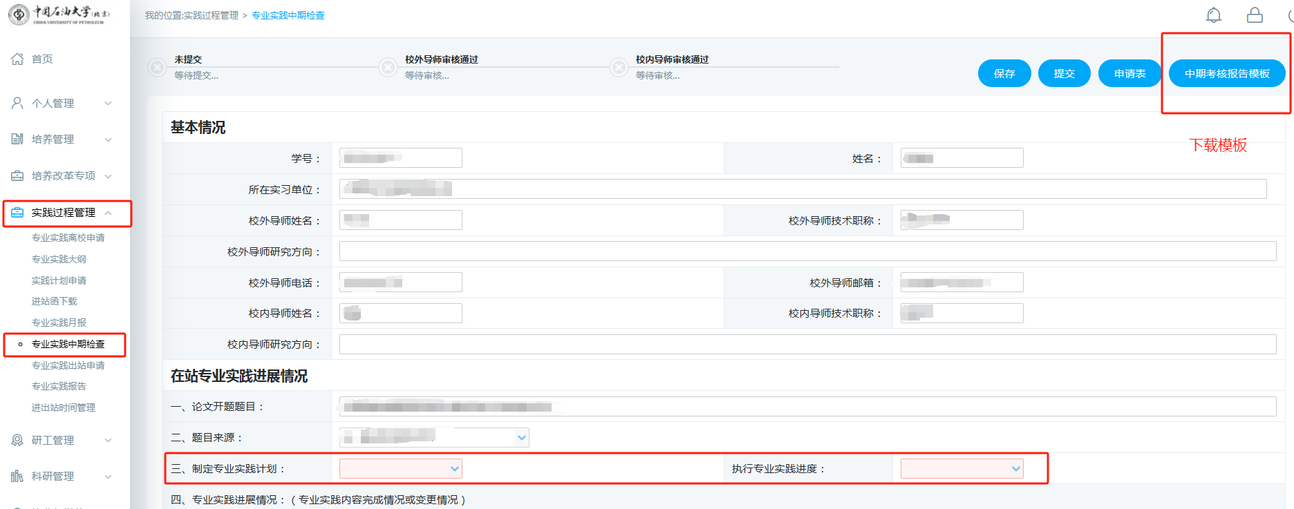 专项硕士生:学生可在系统【实践过程管理】—【专业实践中期检查】模块中,下载报告模板并上传报告,由校外导师、校内导师审核并线上填写考核意见表。