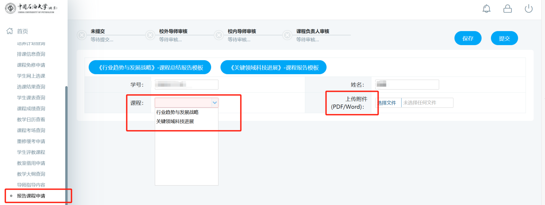 学生可在系统【培养管理】—【报告课程申请】模块中,下载报告模板并上传报告,由校外导师、校内导师和课程负责人审核。