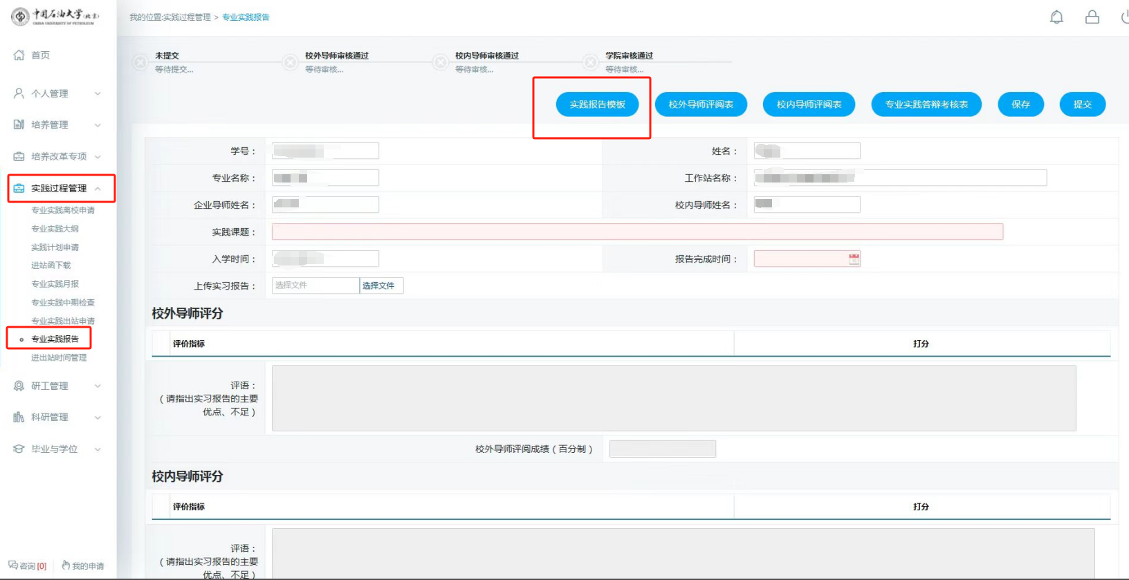 学生可在系统【实践过程管理】—【专业实践报告】模块中下载模板,完成实习报告并在系统中上传附件,由校外导师→校内导师→学院审核;审核通过后方可参加专业实践答辩,答辩前应提前下载专业实践答辩考核表,用于填写专家意见。