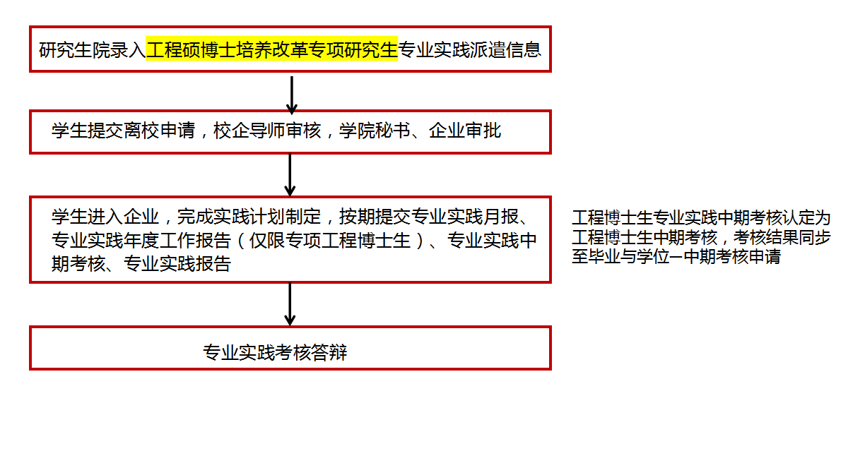 工程博士本科直博项目的第3-5学年;在职博士生的第2-4学年;工程硕士的第2-3学年,入企开展专业实践、毕业设计或学位论文工作,进行综合考核。