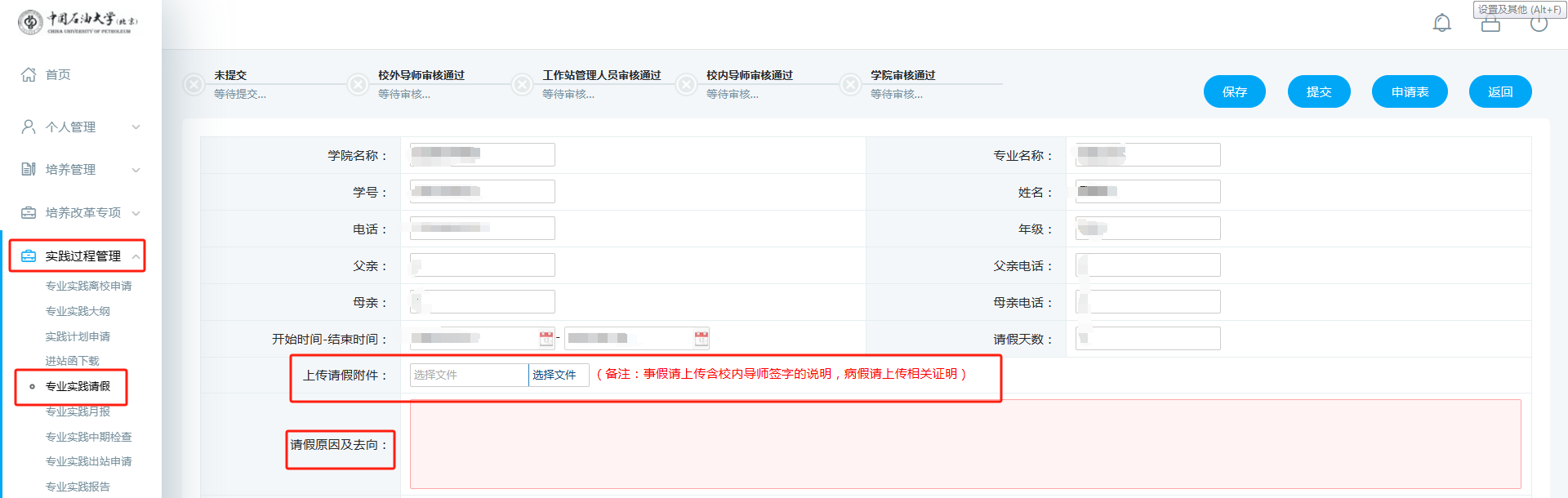 在专业实践期间,学生因病或其他原因,需要暂时离开企业,请假一周以上,须在研究生信息管理系统【实践过程管理】—【专业实践请假】栏目中点击“新增”按钮,填写、提交请假申请。按照学籍管理规定,最长时间不得超过一个月,须请假审批成功方可离开企业,具体流程为:学生→企业导师→企业管理员→学校导师→各学院教学院长→研究生工作部(一周以上)。