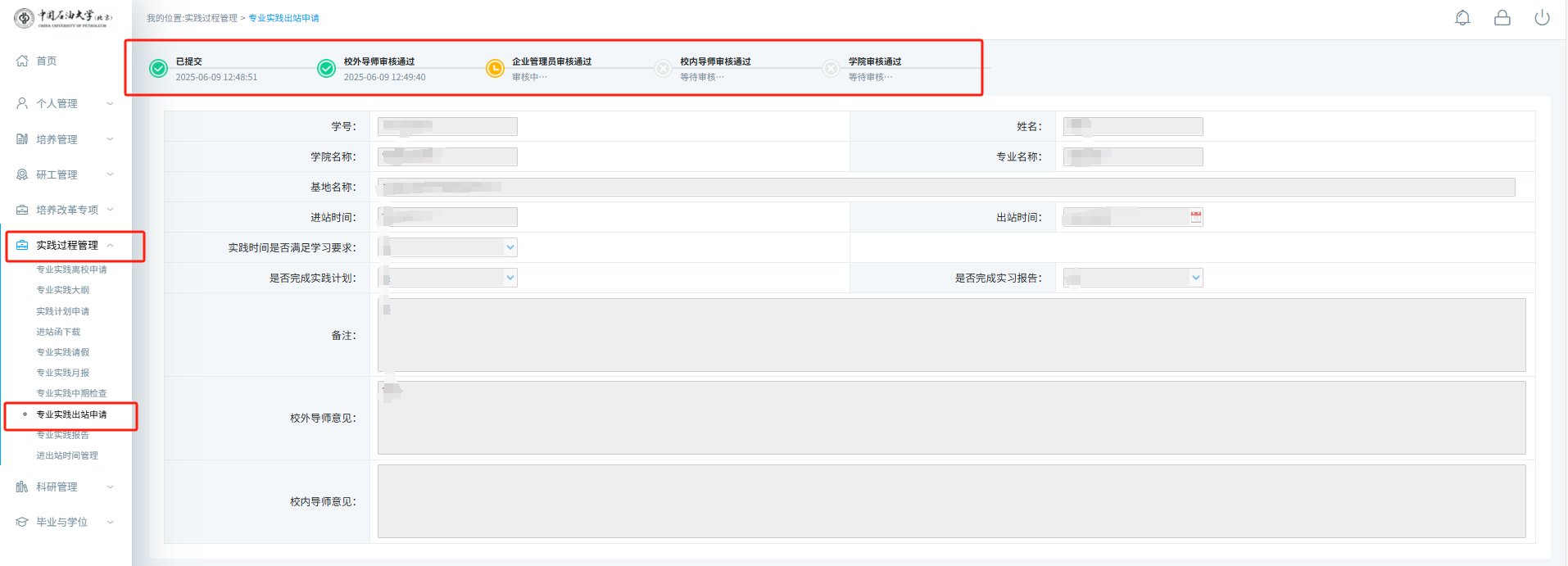 学生在满足学校和联合培养企业的要求前提下,在系统【实践过程管理】—【专业实践出站申请】模块中提交申请;经校外导师、企业管理员、校内导师、学院审核后方可出站。